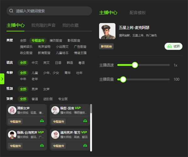 3、声音广场:搜索你喜欢的主播、角色一键生成同款。
