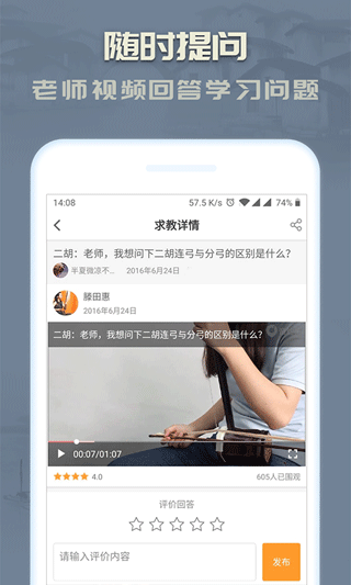 “二胡”APP为您提供与音乐学院老师教练的沟通平台,古筝老师及时视频回答您的提问。“二胡”APP为您提供广大音乐爱好者交流学习的平台,学音乐不再枯燥!