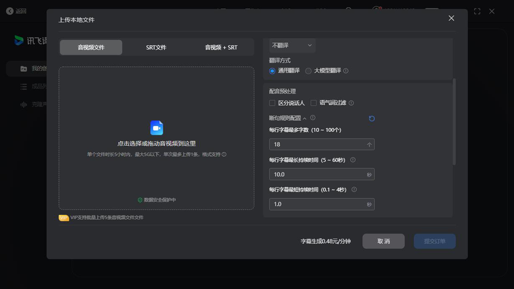 -选择音视频后上传,过程中可检查上传进度,并继续上传其他任务。用户可在页面右侧选择音视频语言,翻译语言,制定字幕断句规则。