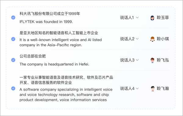 - 选择结束后,配合翻译功能,可一键为用户的视频更换音色,满足用户多语种、个性化音视频制作的需求。