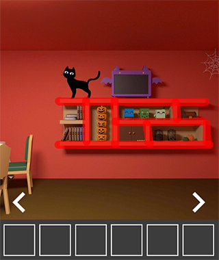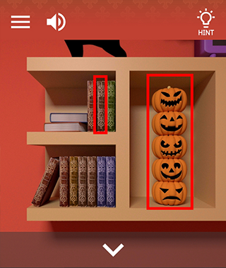 2、点架子中间的柜子,输入密码打开获得半片纸。后退点左边南瓜,记住南瓜表情,南瓜左边中间的书打开发现幽灵。