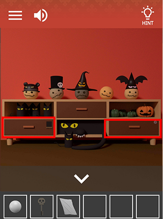 6、继续右转,点左边南瓜,根据之前看到的南瓜表情调整,记住从上往下的颜色,下方抽屉打开获得火柴。