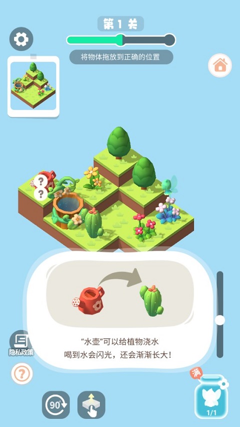 4、“水壶”可以给植物浇水,喝到水会闪光,还会渐渐长大!拖动物体可进行任意摆放,不需要了可投入许愿池回收。