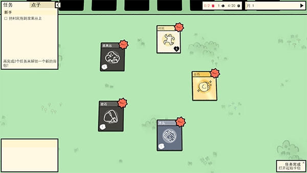 通过寻找想法卡片来扩展你的知识。一张创意卡将告诉你如何制作新卡片,例如:堆叠2块木头、1块石头和1个村民来建造一座房子。