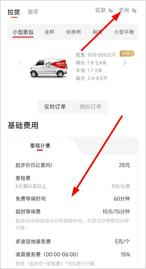 4、假设线路切换为北京市区—大兴,选择拉货服务,就可以看到基础收费标准是多少价格多长时间了,如果用户有搬货需求,可下拉至其他费用,点击右侧计价参考;