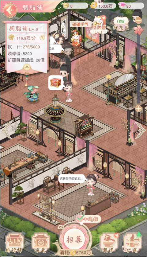 掌柜可自由派遣伙伴进驻店铺,伙伴可帮助掌柜管理店铺,提升赚钱效率,同时进行招募及装修、扩建也可提升经营效率,获得更多的铜币。