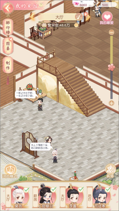 1、掌柜可收集家具,自由布置房间,集齐家具套装后可给所有伙伴提供属性加成