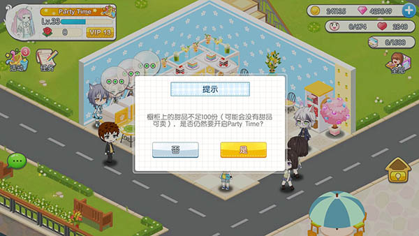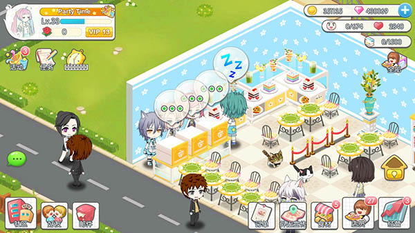 此外,不得不提一下Partytime。在店长们专心经营店铺的时候,其实已经开始不知不觉的积累Parytime的能量槽了。能量可以通过售卖甜品、点击客人头上的甜品或Combo气泡,或是点击清理桌面获得。当Parytime数值攒满后即可点击开启。在开启Partytime过程中将加速出售甜品的速度,效果持续30秒。所以一定要先制作出足够的甜品再开启哦!