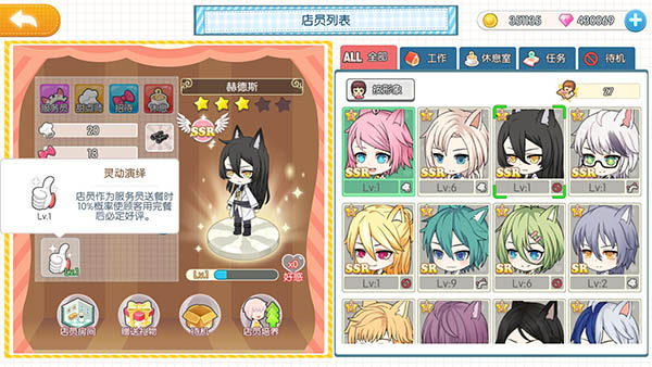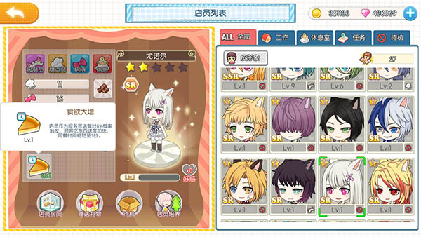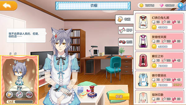 顺便一提,购买的衣服、配饰只可以为当前角色装扮,购买前请确认好店员哦。换装后的店员在经营时的Q版形象同样也会发生改变哒!