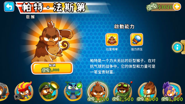 $7,500 = 自身增加8%攻击范围,每回合获得$2500,范围内其他猴子增加10%攻速,20%攻击范围,穿透+3,降低10%升级价格