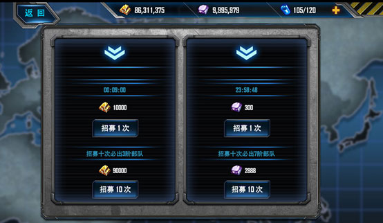 兵员招募花费金条,可获得1-3阶部队;精英兵员招募花费钻石,可获得5-7阶部队。