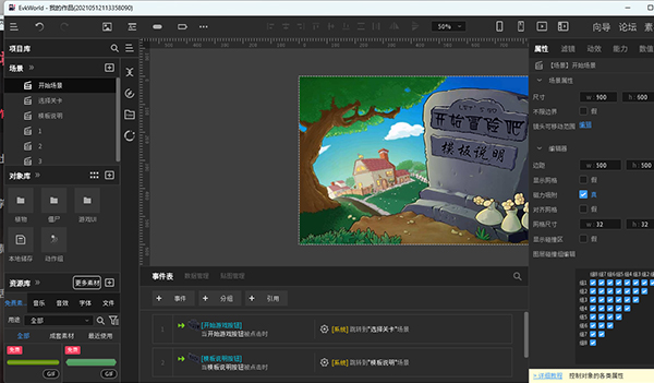 3、然后打开素材后按照上述的操作介绍操作即可,也就是给这些素材增加些属性、事件等