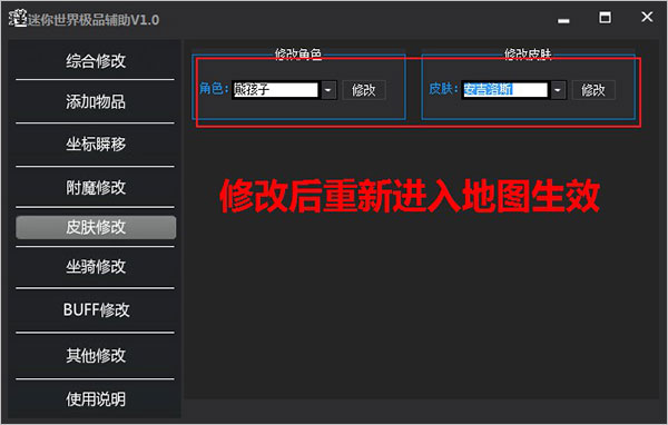 5、能够进行皮肤的修改,修改之后需重新进入地图才生效;