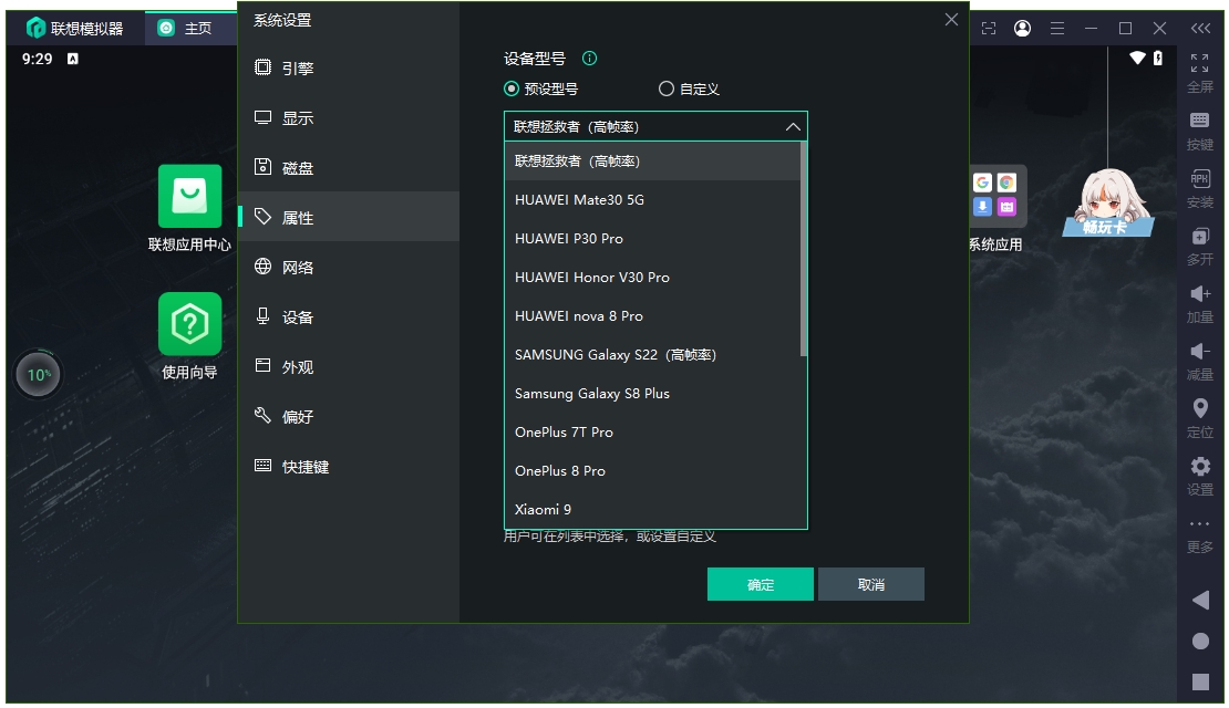 4、在属性功能键中选择你想要的预设型号,里面为用户提供了各种多种不同类型的手机型号,最后点击确定即可。