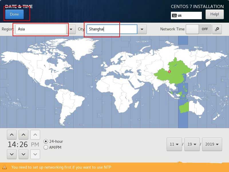 6、时区设置,地区选择Asia,城市选择Shanghai: