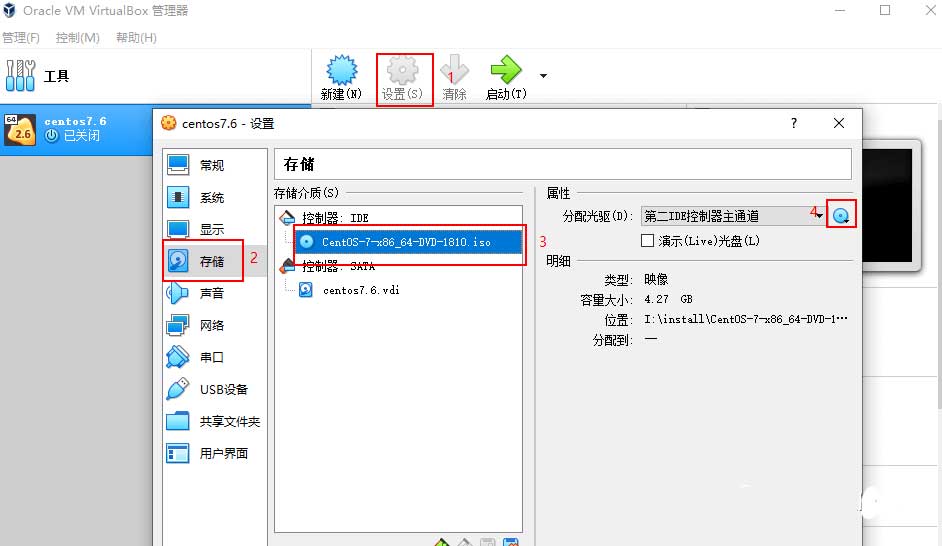 1、为虚拟机添加虚拟光盘,虚拟光盘指定为我们下载的ISO镜像文件: