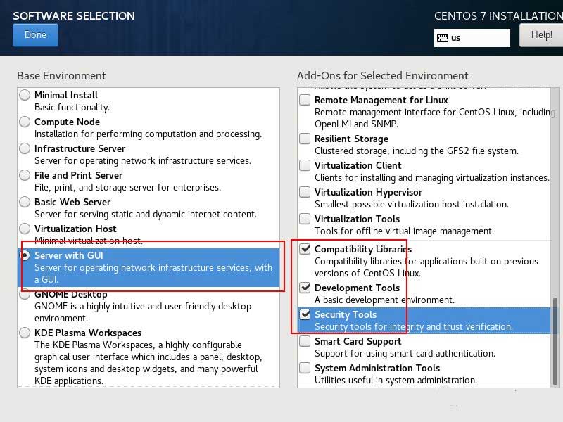8、软件安装设置选择Server with GUI,同时选择如图三种附加环境: