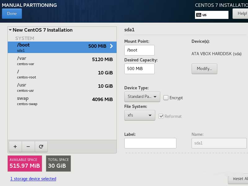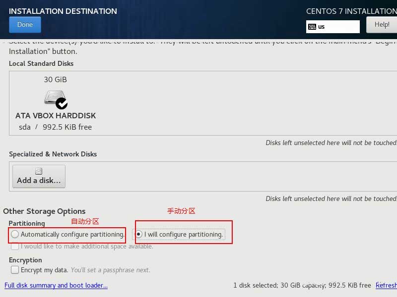 9、磁盘分区设置,由于我的虚拟机设置的内存较小,需要创建一个较大的swap分区,内存设置较大的直接选择自动分区即可,这里我们使用手动分区: