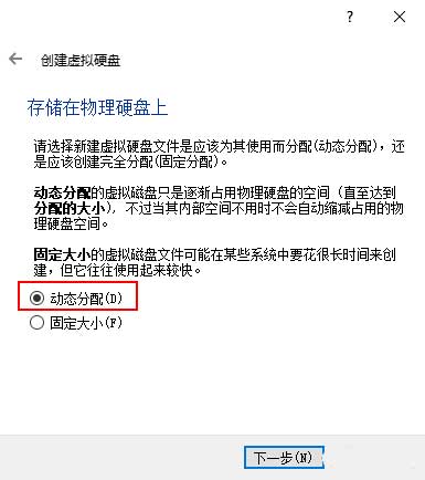 5、选择动态分配空间大小,如果你的硬盘空间比较大的话,可以选择固定大小: