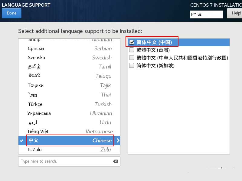 7、语言支持选择安装英文、简体中文两种语言安装包: