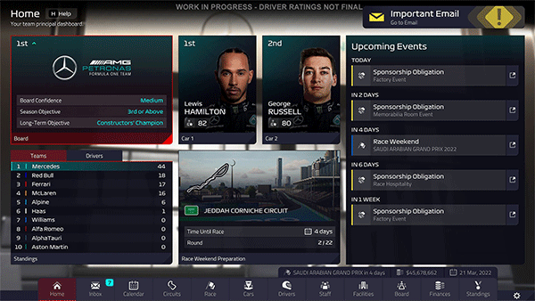 您的制造商团队是赛车运动的核心。在比赛之间,您可以控制车队总部的所有细节。了解您的明星车手和车队的表现,保持您的财务健康,并从您的竞争对手那里挖走最优秀的员工,为您提供额外的优势。