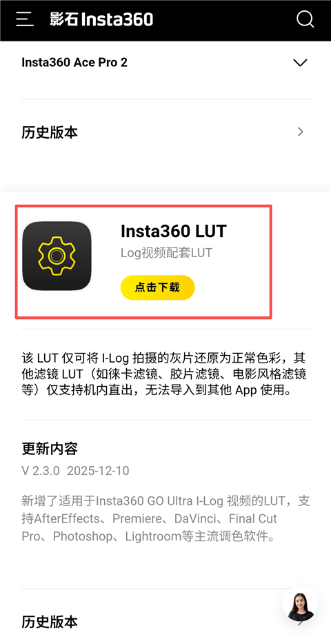 1、先下载需要用的LUT文件,例如,我们要下载影石ACEPRO2的滤镜LUT包,进入影石官网,点击下载选择ACEPRO2点击相关软件下载。