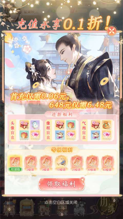 《锦绣商铺0.1折版》是一款模拟经营手游,玩家可以穿越到南唐,用现代商业头脑从零打造店铺,在乱世中逆袭成为首富。游戏不仅有丰富的充值福利和签到奖励,还能揭露四国阴谋、对抗黑心首富,甚至与四位蓝颜知己互动。作为新人玩家,我觉得这款游戏的福利太香了,特别是0.1折充值和送V8的活动,直接降低了入手门槛。