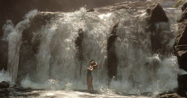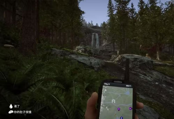 3、来到女野人可能刷新的第1个位置:如图所示的瀑布旁边,如果她不在,我们继续去下一个位置。