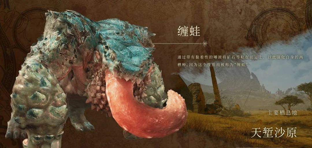 (2)缠蛙:通过黏性唾液粘附矿石强化前足,既是强敌也是重要的素材来源。