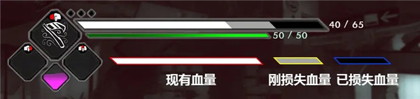 4、白条耗尽时死亡,灰条为上一次受到的攻击伤害,黑条为已经损失的生命值。