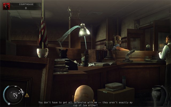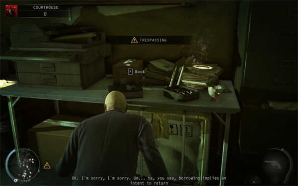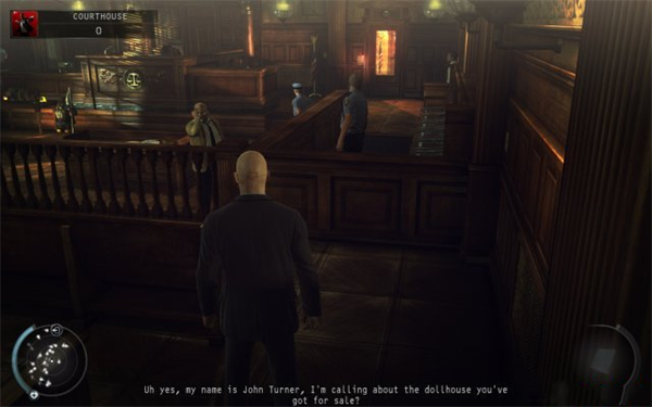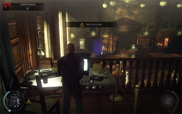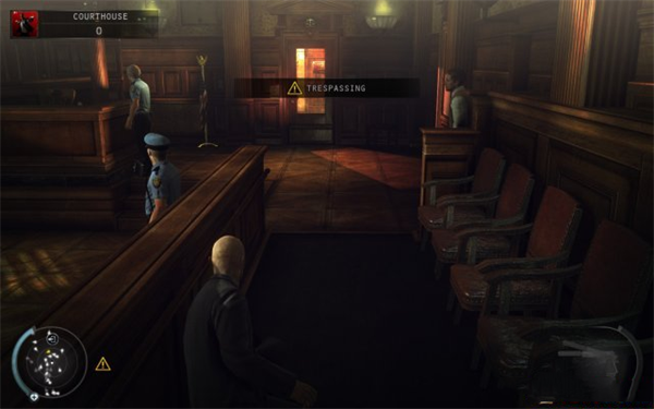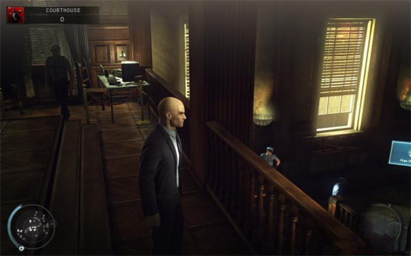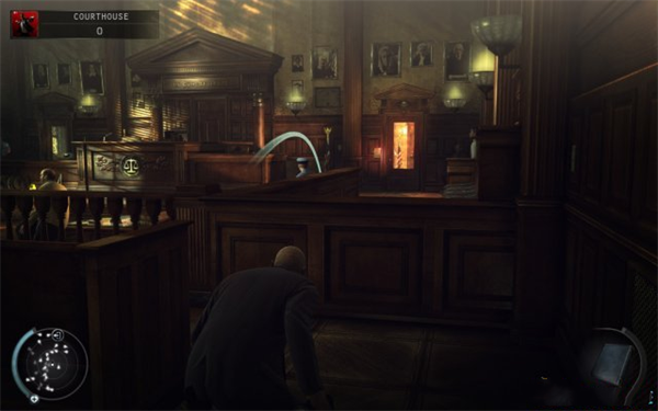 9、开取公认本场景最难的一扇门,进门后不要马上得意忘形去开关底的门。先在如图的位置机动。刚才砸书被引开的首位现在该回来路过通道了。注意在合适的距离左右晃一下让他的目光还没升满就走过去了。好了,现在打开了法庭和监狱之间的分隔门。恭喜,最难的地方已经过去。