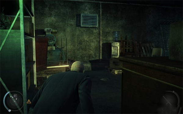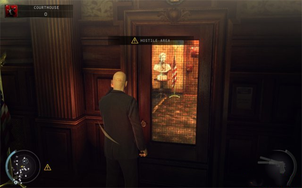 在前台偷一个花瓶。在这里先用本能侦查保安室内的人,等一个背靠墙的首位移动到面壁的位置即可行动,此时刚好室内所有人都在面壁。