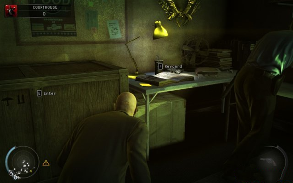 2、穿过第一保安室来到只有一个守卫的第二保安室,偷取Keycard后出门。