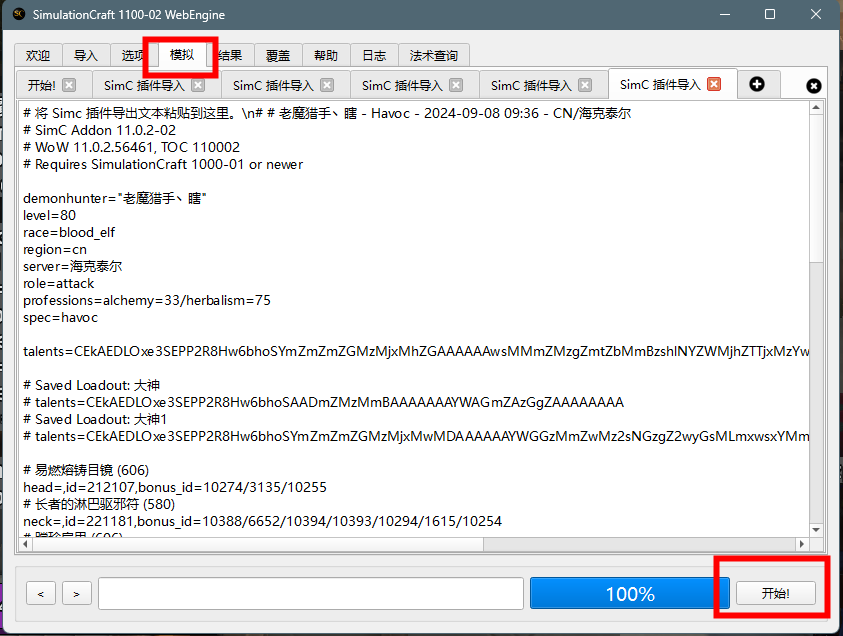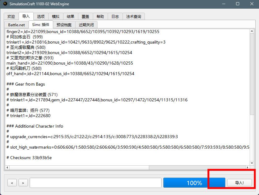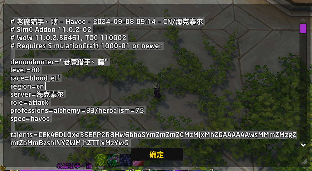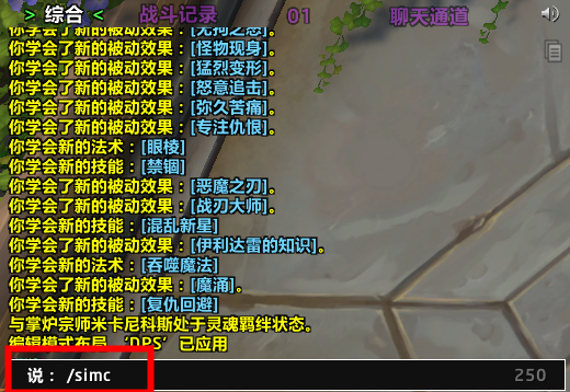由于国服没有英雄榜,所以玩家数据需要手动导出,在游戏内使用/simc命令即可调出玩家数据。