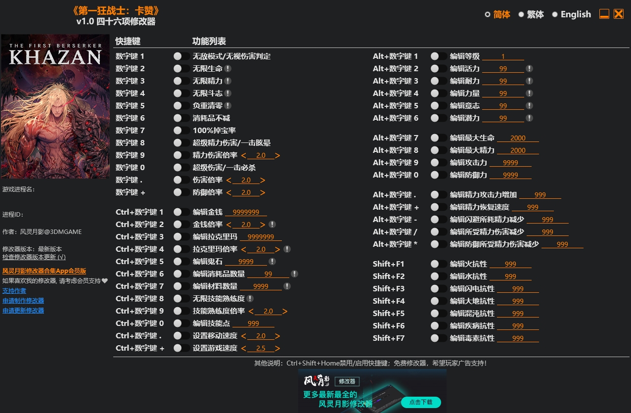 第一狂战士卡赞修改器是一款针对电脑游戏《第一狂战士:卡赞》所推出的多功能辅助工具。在战斗属性修改方面,它可开启无敌模式、设无限生命精力斗志,还能调整伤害与防御倍率改变战斗难度。资源与物品修改方面,能清零负重,提供消耗品不减、100% 掉宝率,编辑游戏货币、特殊物品及各类材料数量。角色属性编辑时,可修改等级、活力、耐力等属性,调整关键数值与细节属性,编辑各类抗性提升角色生存力。此外,第一狂战士卡赞修改器还能调整游戏及移动速度,方便玩家快速穿梭游戏世界或改变游戏进程!