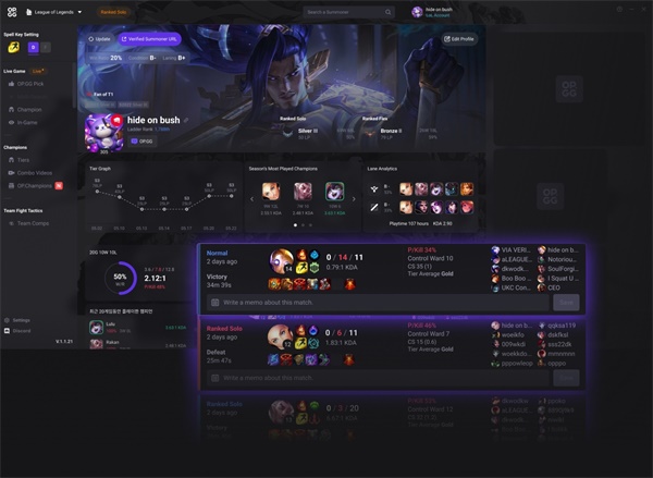 此外,OPGG电脑版还提供了职业视角观战功能,可以随时观察和学习职业选手的游戏策略和技巧。对于想要收集高端对局信息的玩家来说,能够大大提升自己的游戏水平。