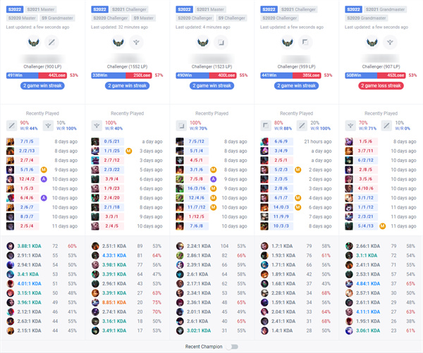 加入大厅后,复制大厅聊天并将其粘贴到多重搜索选项卡中。这将为您提供所有召唤师的统计数据,包括单人排名、胜率、连胜/连败。最常玩的冠军,以及最近的成就(MVP/ACE)。