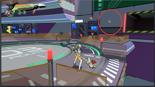 10、修完之后出来,平台开始刷怪,打完怪之后如果你在电梯上会被强行送下去,再次跳上来,绕着电梯走到一个标着??的口,跳到转圈平台上去,跳到有吸尘机器人的平台上,往右看,有一个包裹。