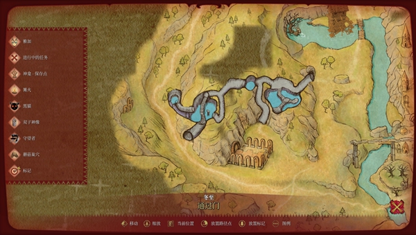 左上角那个山上是加血量上限的。右上角那个是图腾,周围也有不少玫瑰,有不少跳跳乐。中间桥下面那块墓地里有个箱子和统一雕像,需要完成一个小谜题,把四根柱子对准中间就可以了。右边的红色标记是统一雕像。