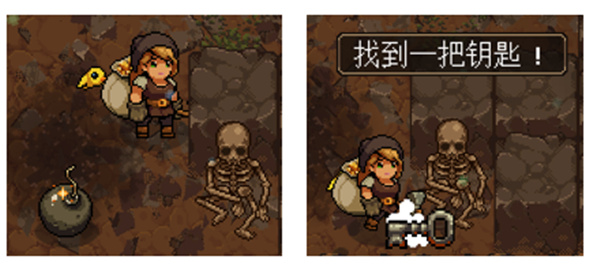 和前辈互动概率搜出钥匙或炸弹,较小概率搜出钥匙环(2枚钥匙)、炸弹包(3颗炸弹)