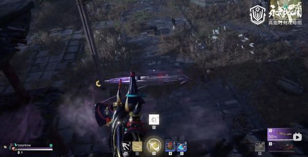 妖刀姬在完成振刀后使出了以自身环绕的紫刃,之后缓慢向前推进,这里可以看到紫刃的速度明显慢与之前的F技能,并且没有了二段按键提醒