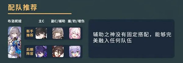 布洛妮娅的小技能给队友净化清负面,还能提升攻击力,附带拉条机制,立刻行动不看回合。几乎可以和所有角色形成良好配合,终结技还能全队提升攻击力和暴击伤害,机制又多又强,辅助的天花板没有之一。技能加点:终结技=战技>天赋>普攻。
