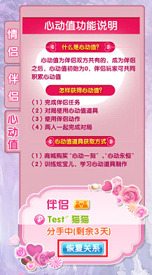 在分手期内,主动提出分手人可以选择恢复关系,一切情侣相关(例如心动值)均不会受影响(被分手的一方无法选择恢复关系)。选择恢复关系后,之前消耗的伴侣解除书不会归还。
