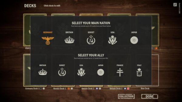 你需要从二战中的五个主要阵营中选择一个来打造自己的卡组并与其他玩家进行对抗。每个卡组都可添加一个盟国,你可以从盟国获得支援,进而取得战略上的优势。