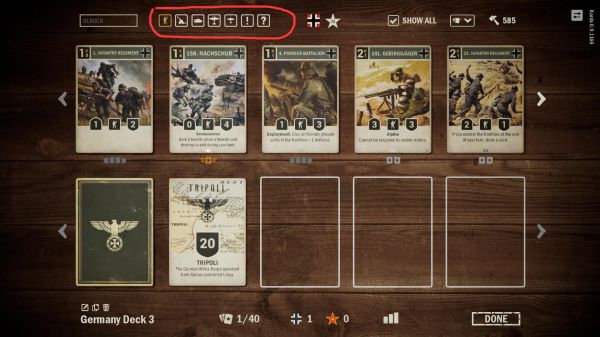 8、点击在左边的一列标志,可以查看指定的卡牌类型,从左到右分别是:步兵、火炮、坦克、轰炸机、战斗机、指令、对策。
