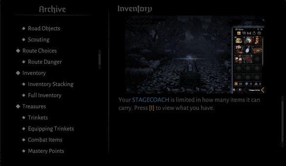 你的背包中所有类型的道具共享所有的格子数,一些道具可以堆叠,有一些则不能,点击右上角的五个符号可以切换不同的种类,从左到右分别是所有、战斗道具、酒馆道具、饰品和马车强化。