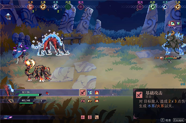 3、开始探索战斗,回合模式使用不同元素技能进行攻击。