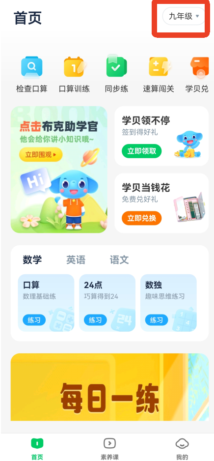 1、小盒素养app提供了多样的练习方式,首先在【首页】的右上角更换孩子的年级,一共就九个年级可以选择。