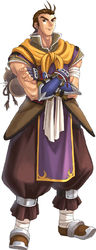 简介:东面的卡尔瓦德共和国出身的巨汉武术家。作为一名游击士,为了参加在王都格兰赛尔举行的格斗大会而来到利贝尔王国。他是一个格外爽朗、平易近人的好汉、对约修亚等人来说也是一个值得信赖的好哥哥,由于这副爽直的性格,他在少女面前总是显得很腼腆。
