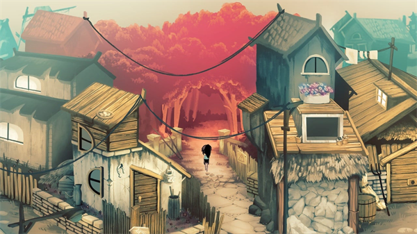 游戏首先使用的氛围塑造就是色彩的明暗对比,在谷仓后面那个场景时,以及村子门前的场景,森林血红色的阴暗与村子的阳光明媚形成鲜明对比,直接给玩家们塑造了一个神秘的悬念。再就是游戏每章开头基本都会有我们的主角露西做的梦中的场景,这部分场景是完全黑白的,像是漫画那样逐帧展现给玩家,而非直接用动画,虽然画面是2D的,但制作组依然成功的利用黑白两种色彩将惊悚展现了出来,直接把体验的诡异感拉满。